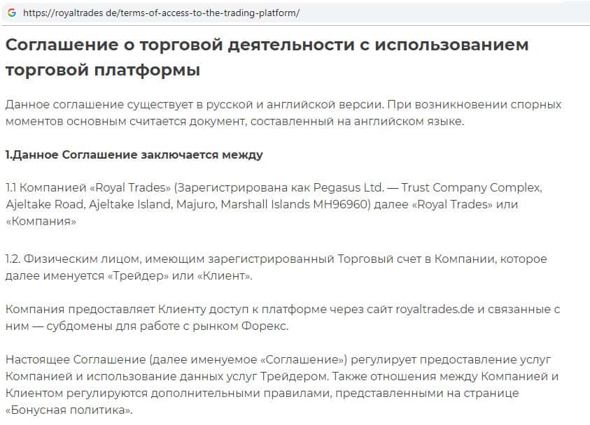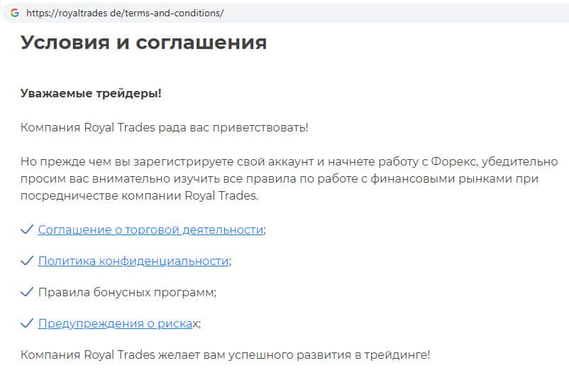 Условия и соглашения на сайте жульнической организации RoyalTrades De