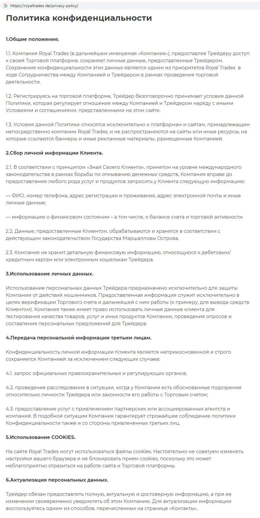 - Политика конфиденциальности мошеннической организации RoyalTrades De