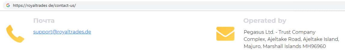 Брокерская контора Роял Трейдс зарегистрирована на территории оффшорного государства Маршалловы Острова. Мошенники RoyalTrades De в контактной информации не указывают своего контактного номера телефона. Но зато имеется адрес электронной почты на сайте скам-брокера, который указан ниже: