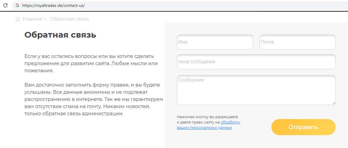 Для того, чтобы каким-либо образом связаться со службой поддержки мошеннической организации RoyalTrades De, необходимо заполнить форму обратной связи, предлагаемую на их официальном сайте. Отправляя им сообщение Вы тем самым даете разрешение на обработку Ваших персональных данных.