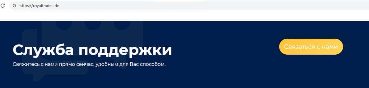 Жулики скам-конторы Роял Трейдс предлагают якобы службу поддержки по вопросам торговли на их сайте. Для того, чтобы с ними связаться пользователю необходимо зарегистрироваться и заполнить форму обратной связи. Ни в коем случае не оставляйте свои данные на сайте мошенников RoyalTrades De.