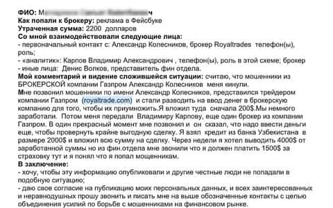 В данном разделе предлагаем ознакомиться с первоочередной и подробной жалобой об обманщиках RoyalTrades, которые развели клиента на 2200 долларов США.