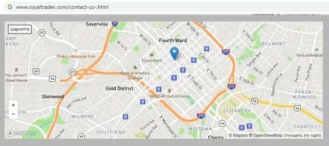 Жулики RoyalTrades на своем сайте разместили карту о местонахождении компании, судя по всему аферисты прячутся в городе Шарлотт, США.