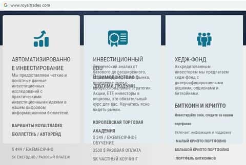 - Услуги предлагаемые на онлайн-портале мошенников Роял Трейдс Ком