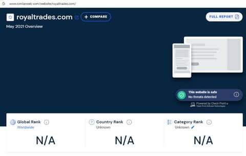 При проверке источников бренда по странам конторы Роял Трейдс Ком на сайте similarweb com, информация отсутствует, что является признаком фальшивого лохотрона.