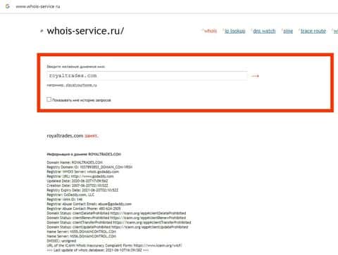Проведя анализ данных по сайту RoyalTrades, не было обнаружено информации о владельце домена, что является еще одним признаком того, что имеем дело с лохотроном.