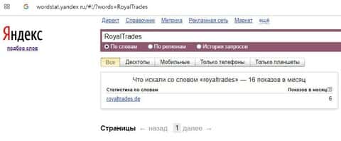 Количество брендовых запросов названия компании на английском языке "RoyalTrades" на wordstat yandex ru составляет 16 показов за месяц.