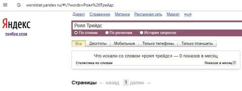 Количество брендовых запросов названия компании на русском языке "Роял Трейдс" на Яндекс Вордстарт вероятно равно 0.
