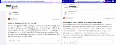 В сети интернет аферисты s2trade имеют довольно низкую популярность и рейтинг доверия в связи со своей наглой и мошеннической деятельностью, в результате которой много клиентов теряют свои деньги. На изображении ниже вы можете прочесть один из негативных отзывов об аферистах С 2 Трейд.