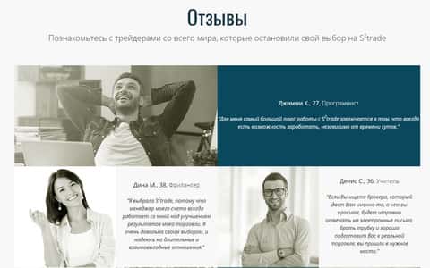 Далее на сайте аферистов С 2 Трейд следует раздел с якобы отзывами клиентов. Данные отзывы ни к какой системе не подключены, и являются текстом, написанным самими шулерами s2trade, сайт которых полон очень устаревшими фишками и элементами для привлечения клиентов.
