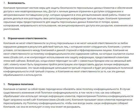 Завершается данная политика конфиденциальности аферистов С 2 Трейд ограничением ответственности их за любую утечку данных клиентов, а так же информацией о том что шулера s2trade могут в любой момент времени внести изменения в данную политику конфиденциальности.