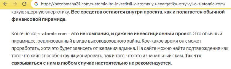 О мошенниках S-Atomic в интернете очень мало информации, похоже на то, что шарага просто слилась и решила уйти от ответственности путем поломки сайта или просто соскамиться. С другой стороны это и хорошо, меньше людей пострадают от них, которые доверчиво вкладывали средства в эту темную яму.