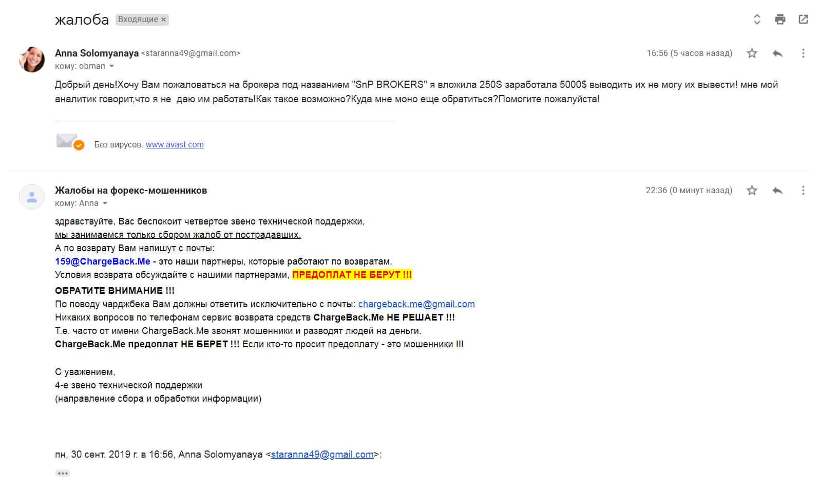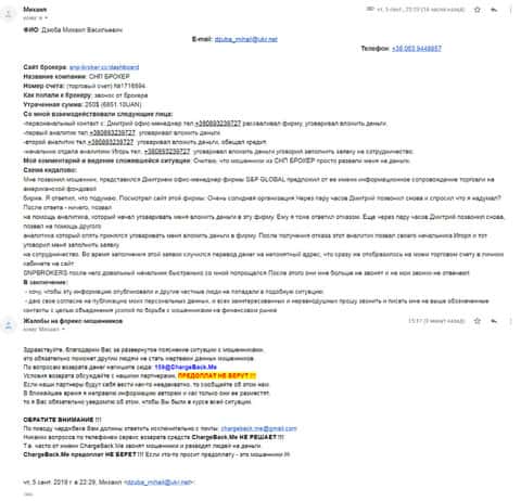 Девушка написала жалобу с просьбой о помощи так как она вложила деньги в шарагу СНП Брокер, а она через время соскамилась с концами. Ей посоветовали подруги написать в организацию Chargeback.Me все подробности развода и они, используя свои методы, возможно смогут помочь пострадавшей.
