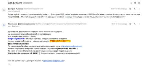 Дилинговая кухня СНП Брокер успела украсть денег еще у одного клиента. Человек вложил своих кровных 4500 долларов и через время его стали просить оплатить налог за вывод суммы в 4 раза больше вложений. Откуда такие деньги они не объяснили, поэтому жертва отправил подробности для разбирательства в компанию ChargeBack.Me