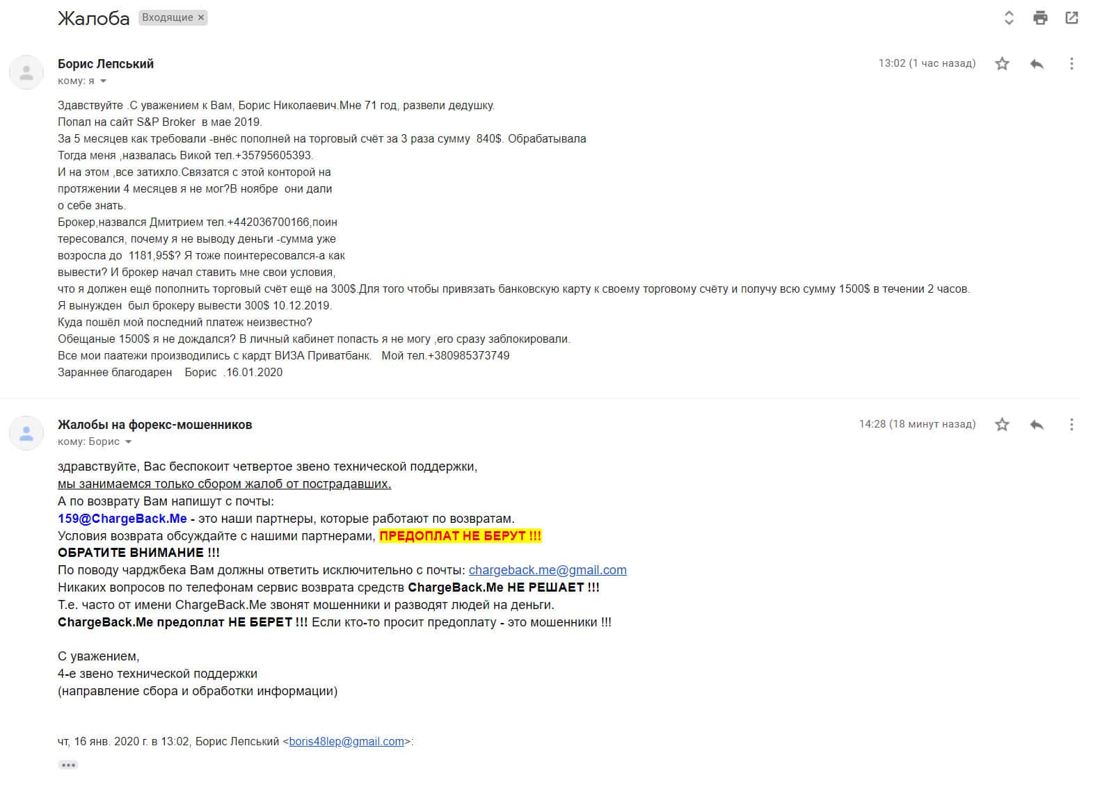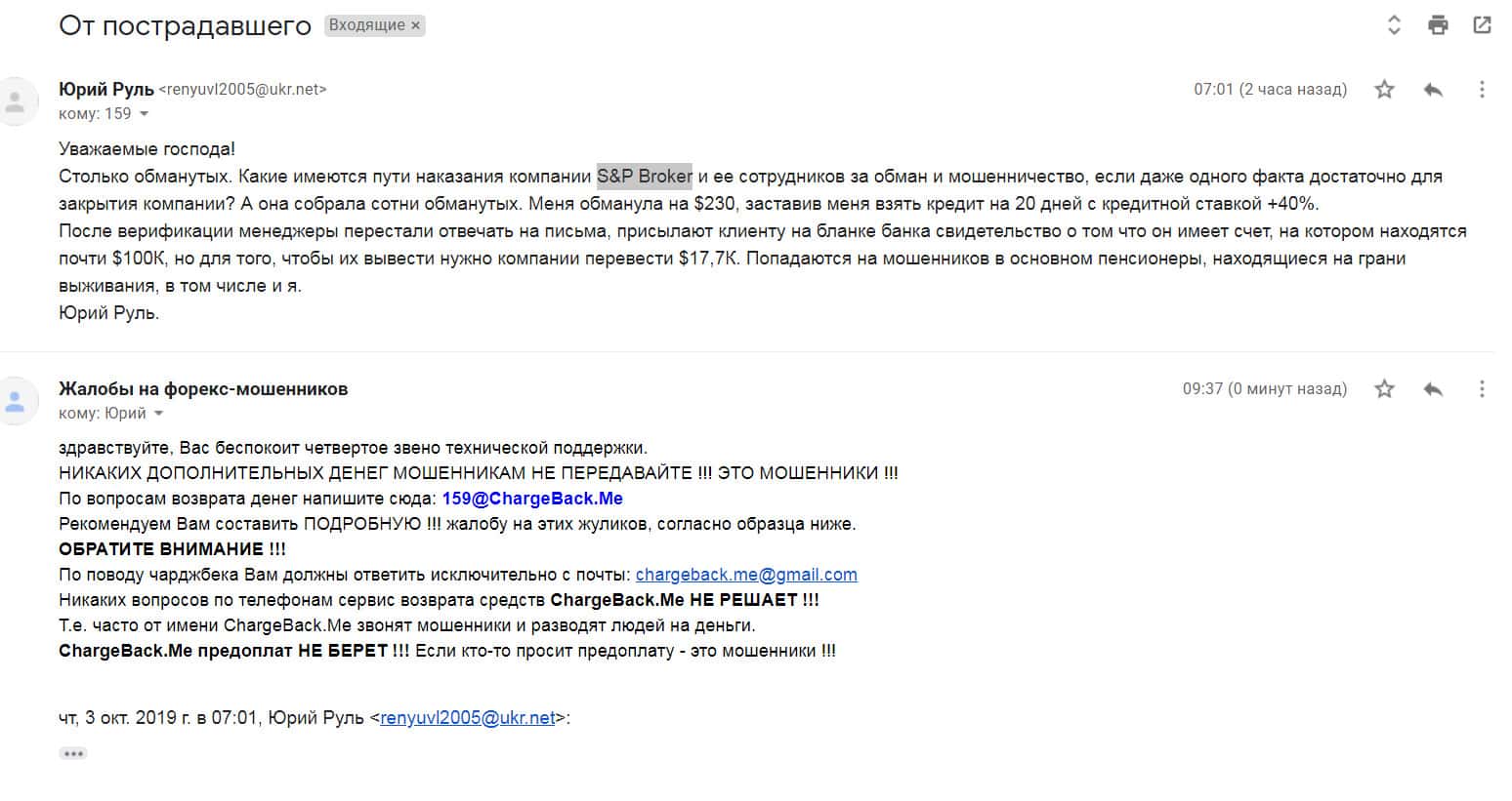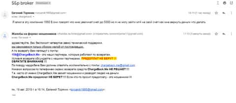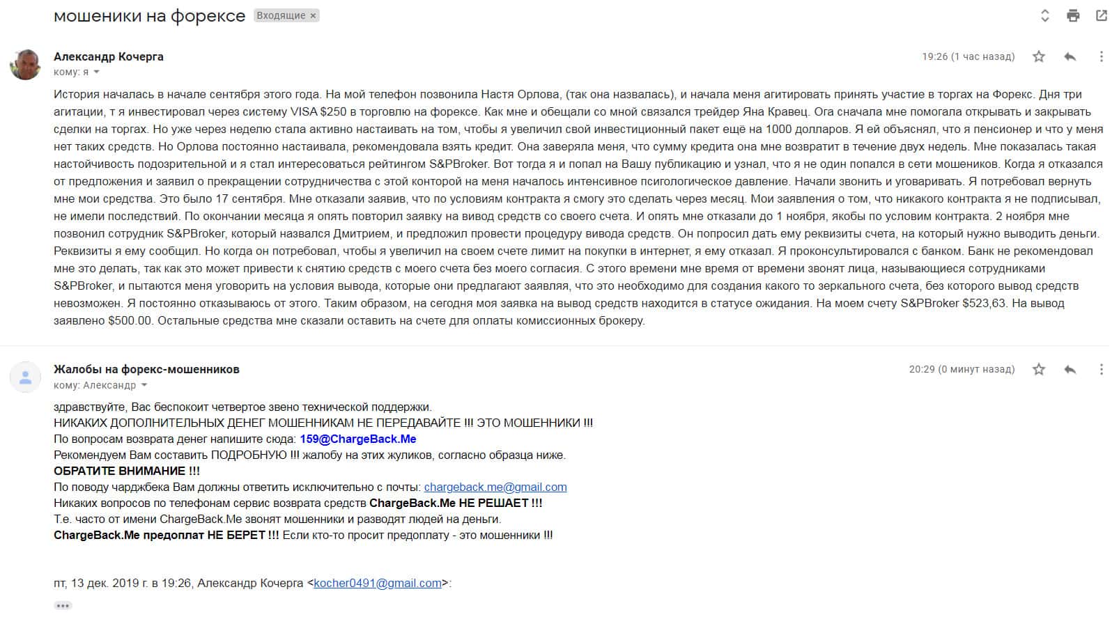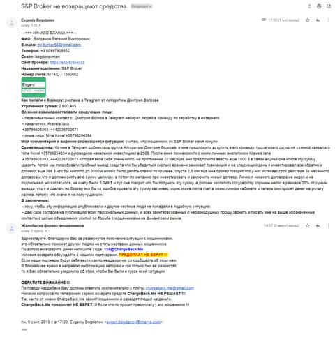 Пришло письмо еще от одного человека, который по своей глупости попал в брокерскую контору S&P Broker. Менеджеры уговорили вложить его огромную сумму денег, которые обещали вернуть за короткое время с процентами. Но по итогу их взаимоотношений, жулье не отдало даже вложенные средства.
