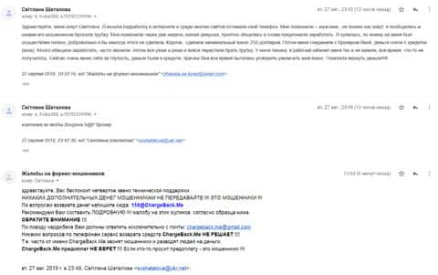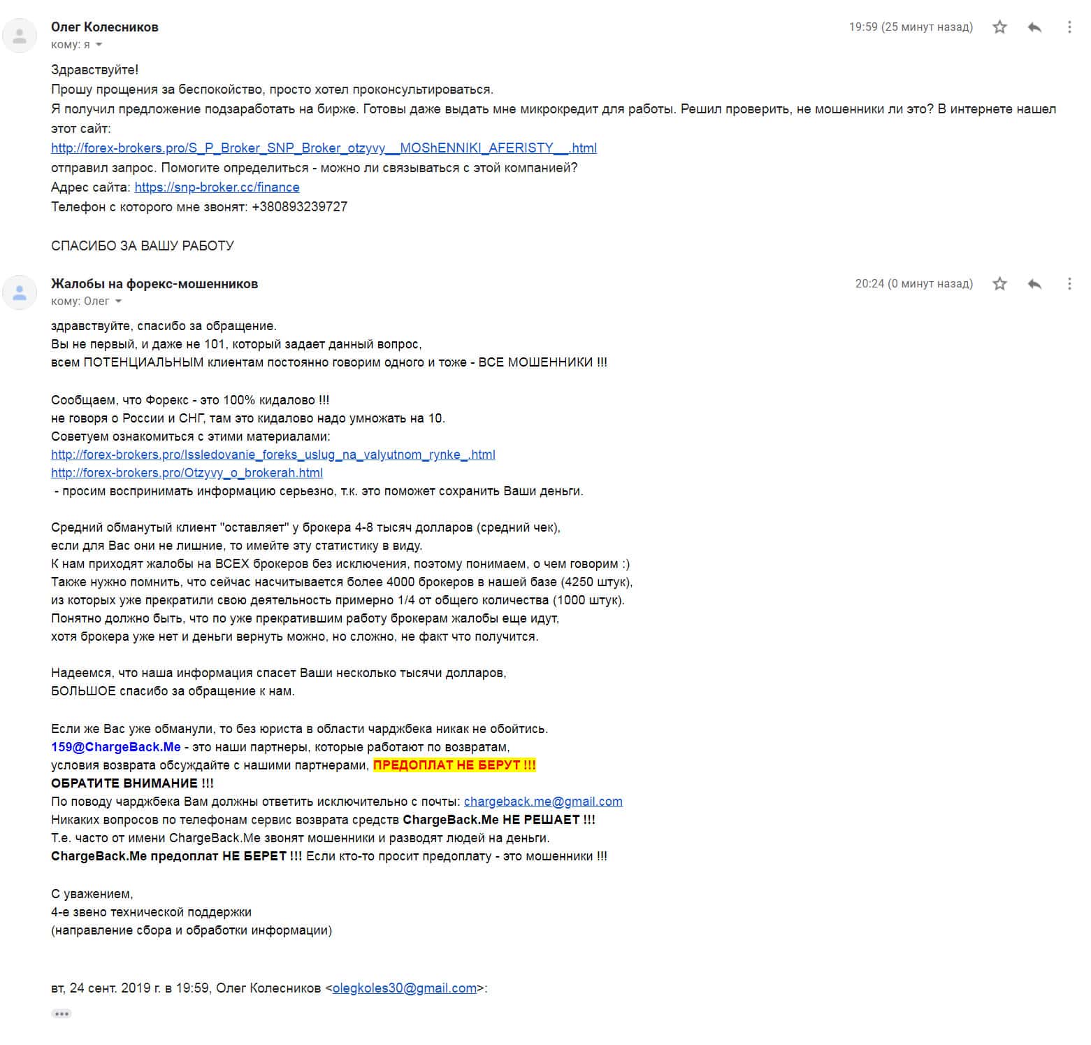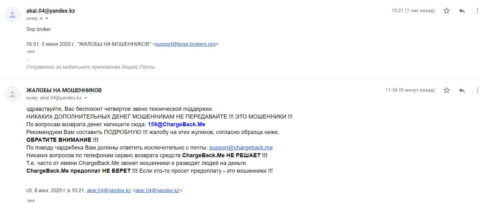 Еще одна полезная информация была найдена в одном письме, которое прислала жертва лохотрона СНП Брокер. Жулики выманили у клиента около 100 долларов с обещаниями, что они научат торговать и он будет зарабатывать хорошие деньги. Потом аферисты стали требовать пин-код от карты банка и жертва поняла, что это развод.