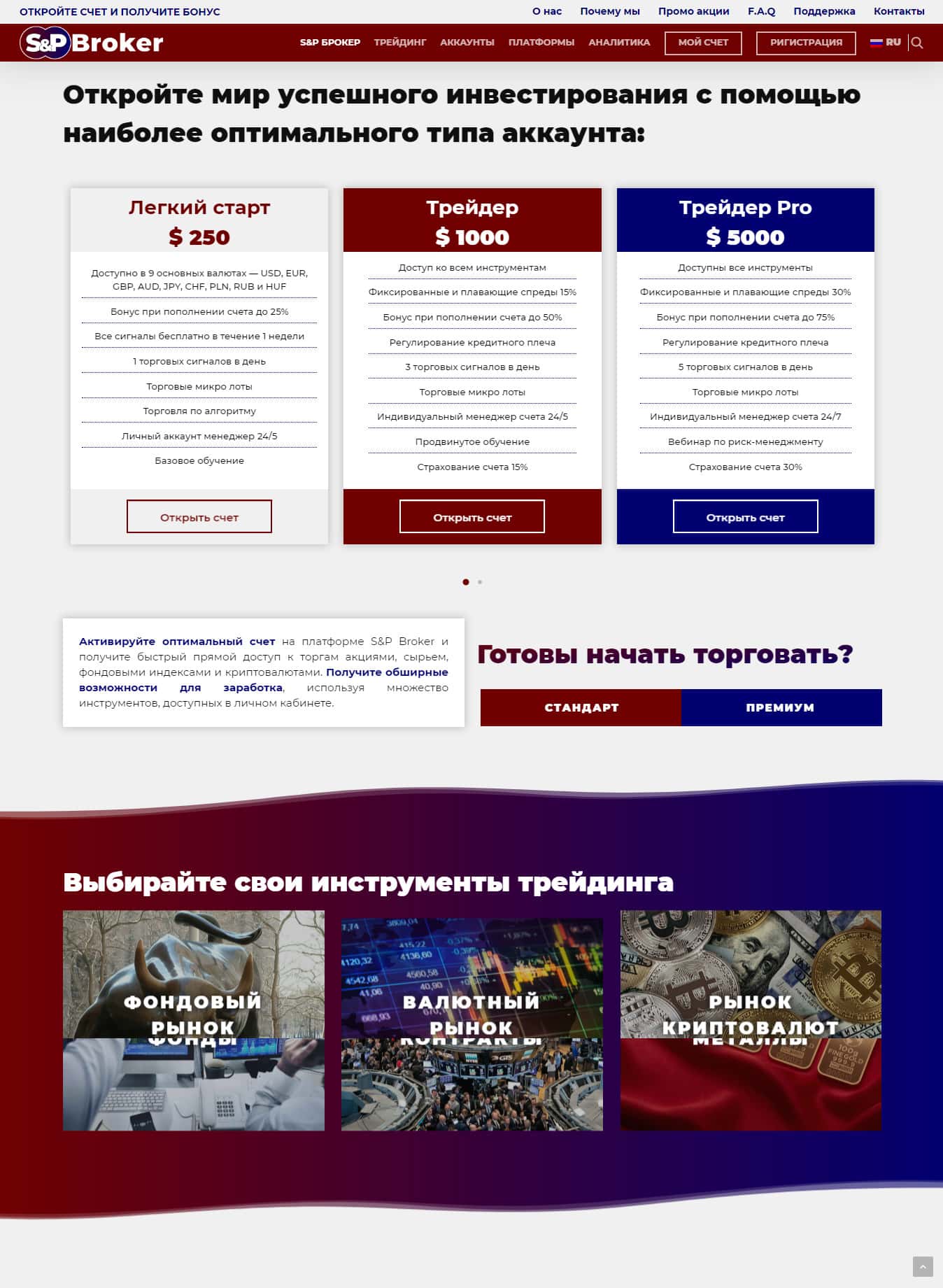 Далее по сайту не прекращается завлекалово и далее мы можем увидеть, как аферисты СНП Брокер, предлагают новеньким клиентам открыть счет от 250 до 5000 долларов. При чем обосновывается это тем, что типа лучше будут условия, а то что с плечем счет на 250 долларов разорвет на части, никто не предупреждает.