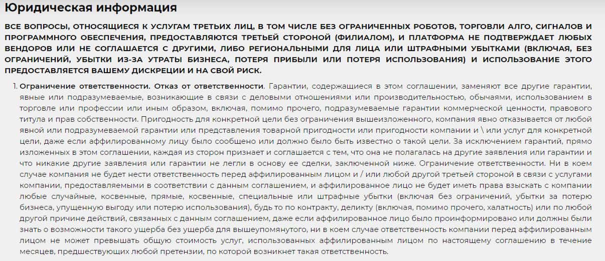 В клиентском соглашении, аферисты СНП Брокер также начинает устанавливать лазейки, через которые они могут уйти от ответственности перед клиентом, в случае если он потеряет все деньги. По их словам раздел Ограничение ответственности есть одним из главных в договоре, поэтому на него можно сослаться при любой ситуации.