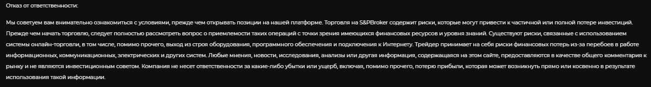 Касательно лицензии на ведение законной деятельности у шаражников S&P Broker нет никакой информации. Вместо этого, они выставили у себя на сайте множество предупреждений о рисках, а также отказ от ответственности, где указали, что не несут ответственность, если клиент, работая с ними, потеряет все свои вложения.