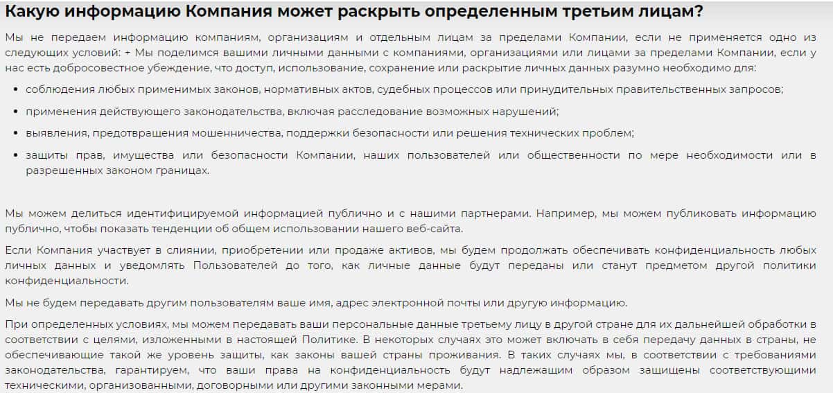 В политике конфиденциальности шараги S&P Broker также есть двойные стандарты, согласно которым они имеют право раскрывать информацию о своих клиентах третьим лицам. И главное, что они не будут нести ответственность за то, что третьи лица могут воспользоваться данными не по назначению.