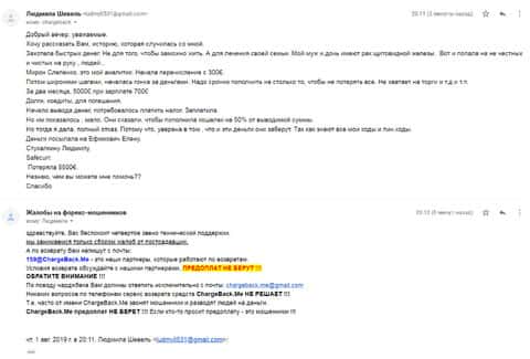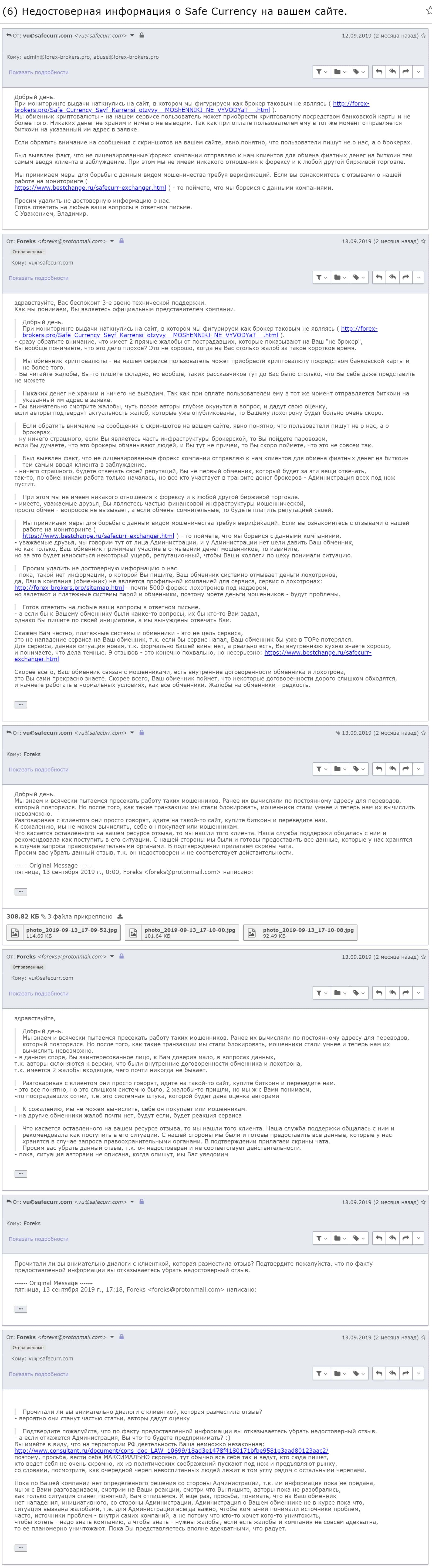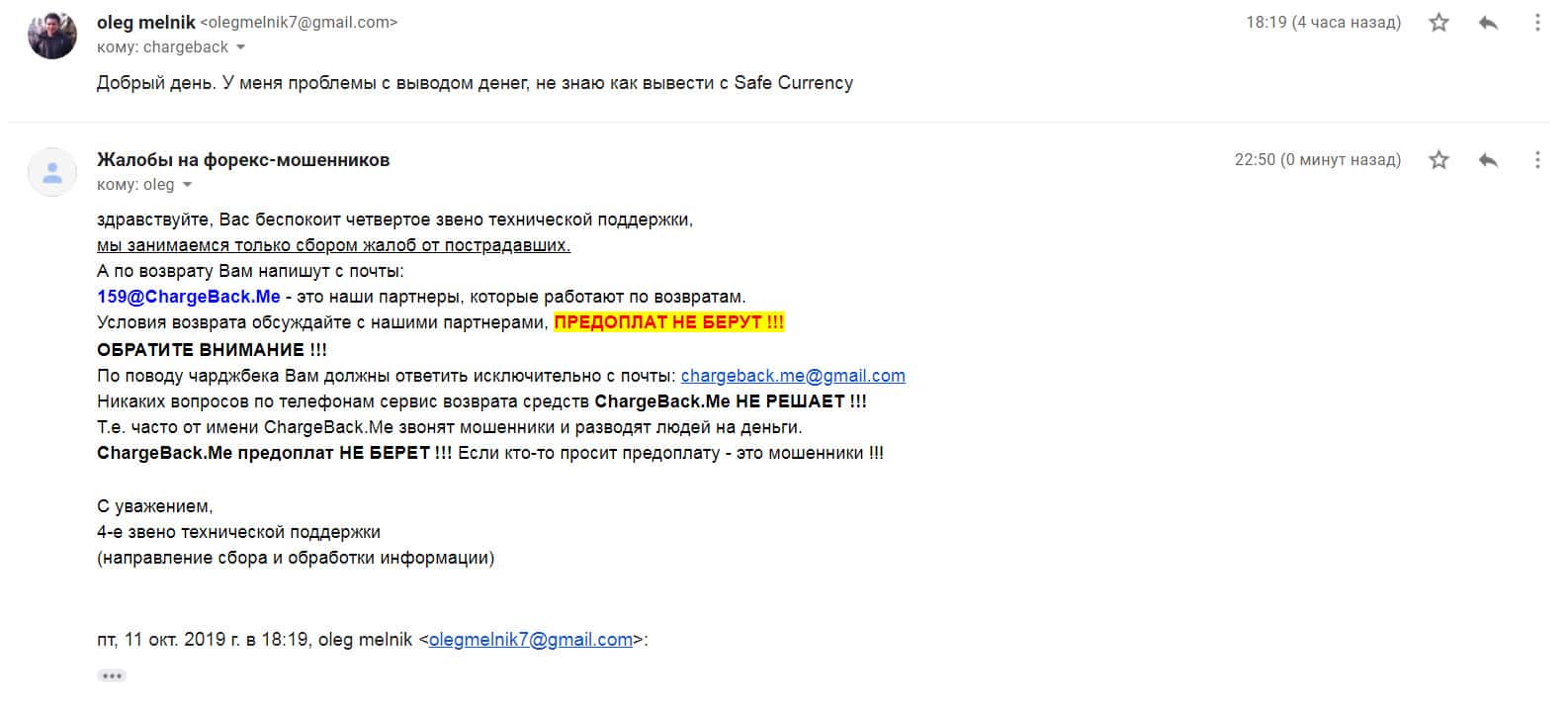 Ниже приводим переписку с официальным представителем Safe Currency. Не видно из переписки, что Safe Currency - это непосредственные мошенники, которые кого-то грубо обманывают. Другое дело, что Safe Currency плохо/хорошо, но понимают, что являются посредниками в мошеннической схеме, т.к. жалоб на них уже не мало, с одной и той же схемой обмана людей, где Safe Currency является частью этой схемы обмана. Все доводы сторон приводим ниже.