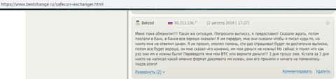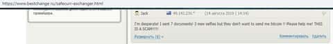 На изображении, расположенном ниже, вы можете наглядно увидеть и прочесть негативный комментарий в сторону аферистов Safe Currency, которые под предлогом обменника нагло развели очередного наивного пользователя сети интернет на деньги, после чего попросту стали тянуть время и нервировать клиента под довольно банальным предлогом верификации, которую у лохотрона Сейф Карренси не возможно пройти.