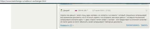 На изображении, расположенном ниже, вы можете наглядно увидеть и прочесть очередной реальный негативный отзыв в сторону лохотрона Сейф Карренси с портала бестчейндж ру, связанный с тем что аферисты Safe Currency отказали очередному наивному пользователю сети в предоставлении услуг и потребовали верификацию, которую жулье Сейф Карренси специально не дает пройти наивному клиенту.