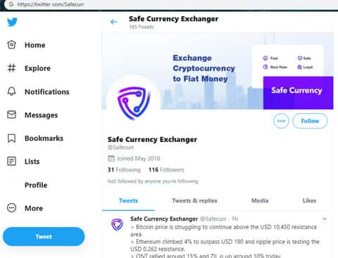 Имеется у жуликов Сейф Карренси и страница в социальной сети Twitter, где лохотрон Safe Currency имеет всего тысячу подписчиков, что в свою очередь говорит о крайне низкой популярности аферистов Сейф Карренси, которые все же пожалели денег на данную страницу в социальной сети. На изображении, расположенном ниже, вы можете увидеть страницу аферистов Safe Currency в социальной сети Твиттер.