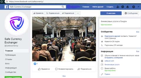 Дабы соответствовать современным трендам аферисты Сейф Карренси обзавелись страницами в социальных сетях, одной из которых стал Facebook, где у лохотрона Safe Currency имеется всего несколько сотен подписчиков, активность которых довольно слабая и сомнительная. На изображении, расположенном ниже, вы можете увидеть внешний вид страницы шулеров Сейф Карренси в социальной сети Фейсбук.