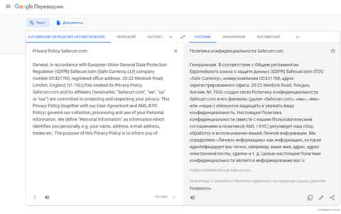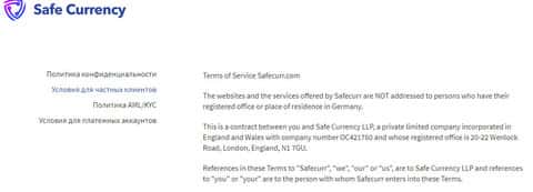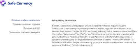 С политикой конфиденциальности у мошенников Сейф Карренси аналогичная ситуация, ведь несмотря на русскоязычность сайта лохотрона Safe Currency политика конфиденциальности у аферистов Сейф Карренси предоставлена на английском языке, что говорит о не особо заинтересованности шулеров Safe Currency в ознакомлении клиентов с данной политикой конфиденциальности.