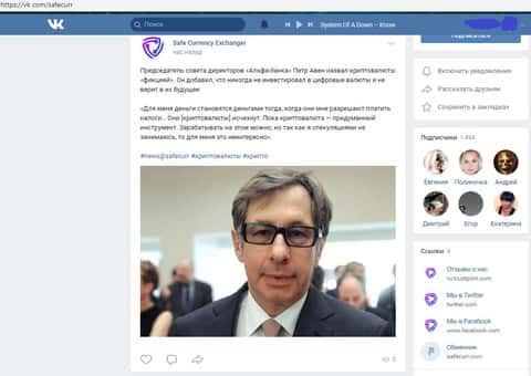 Так же имеется у лохотрона Safe Currency и страница в социальной сети Вконтакте, где шулера Сейф Карренси имеют около тысячи подписчиков, что подтверждает факт того, что аферисты Safe Currency ориентируются именно на русскоязычную аудиторию, которую в дальнейшем нагло кидают на деньги. На изображении, расположенном ниже, вы можете увидеть страницу шулеров Сейф Карренси в социальной сети Вконтакте.