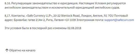 После лохотрон Safe Currency предупреждает о том, что они никем не регулируются, в связи с чем наивные пользователи сети интернет могут понести у мошенников Сейф Карренси убытки, за которые лохотрон Safe Currency не будет нести никакой ответственности. На изображении, расположенном ниже, вы можете увидеть очередной раздел условий сотрудничества лохотрона Сейф Карренси.