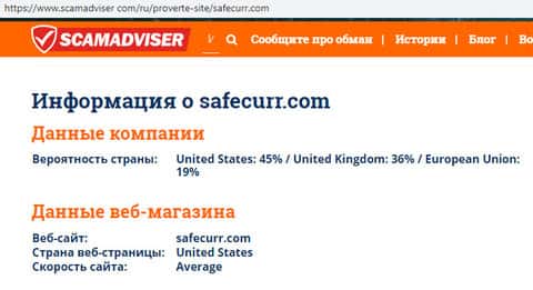 В связи с мошеннической и противозаконной деятельностью лохотрона Safe Currency его реальные руководители предпочитают анонимность дабы избежать ответственности со стороны правоохранительных органов. Информацию о самом же сайте мошенников Сейф Карренси можно узнать с помощью портала scamadviser com, который вы можете наглядно увидеть на изображении, расположенном ниже.
