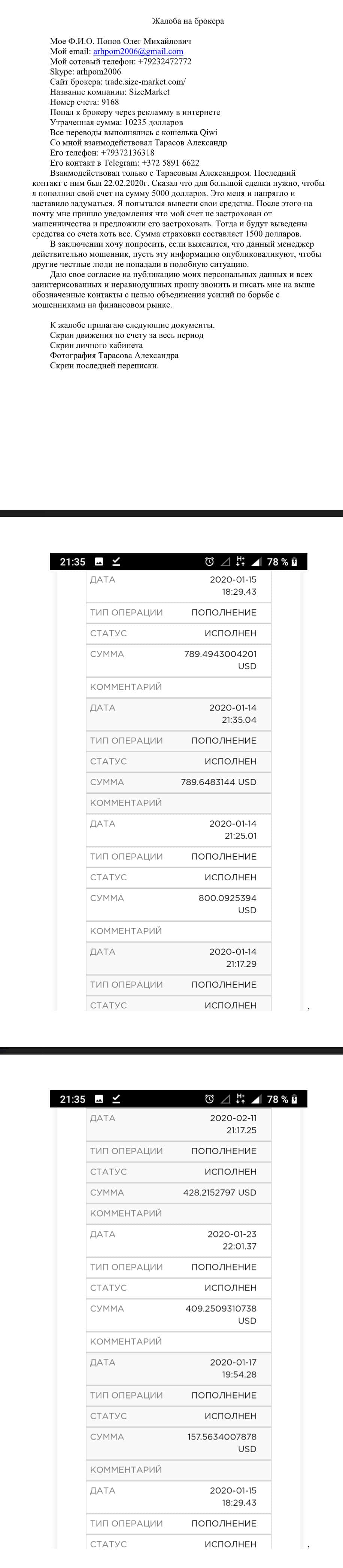 После того, как автор данной жалобы некий Олег Попов пополнил торговый счет, мошенники SizeMarket уведомили его о том, что ему якобы необходимо повторно пополнить баланс для активации. Ни в коем случае нельзя это делать, поскольку деньги на сайте аферистов все равно пропадут !!!