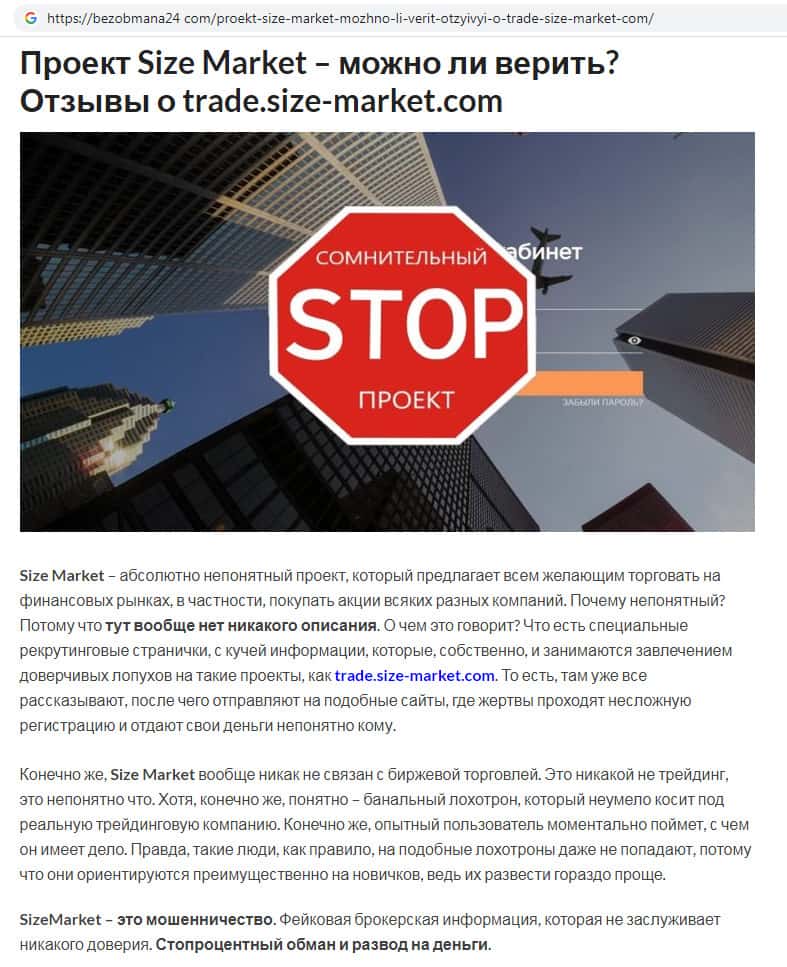 На сайте bezobmana24 com обнаружена статья о мошенничестве со стороны Сайз Маркет. Это абсолютно непонятный проект, где предлагают торговать на якобы финансовых рынках, при этом до самой торговли дело не доходит, поскольку денежные средства клиентов зависают. Никаких доступов к торговле мошенники SizeMarket не предоставляют.