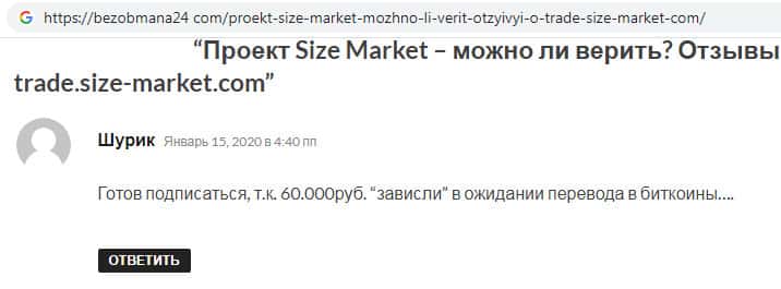 На веб-портале безобмана24 ком замечен пользовательский отзыв о мошенниках SizeMarket. Автор данного отзыва пишет, что его денежные средства попросту зависли в ожидании перевода в биткоины, в результате чего он не смог вернуть свои деньги обратно.