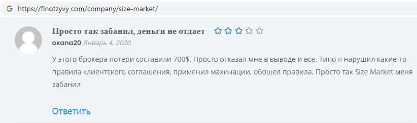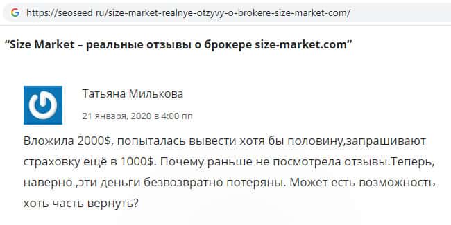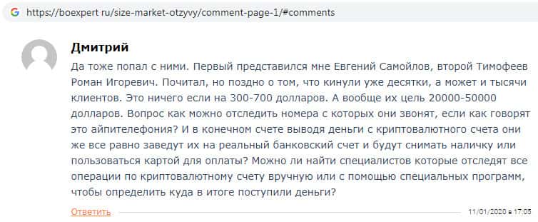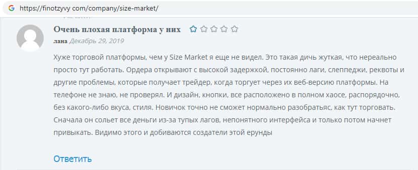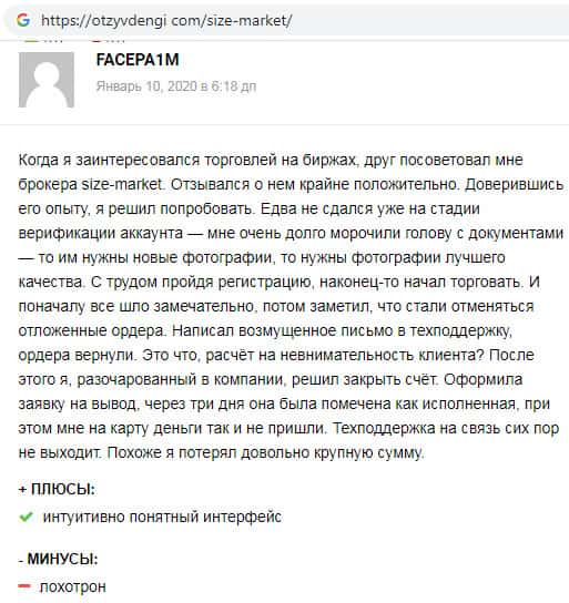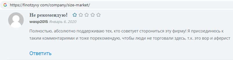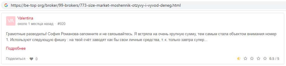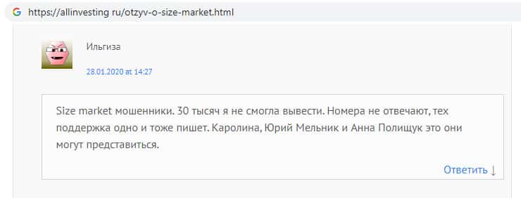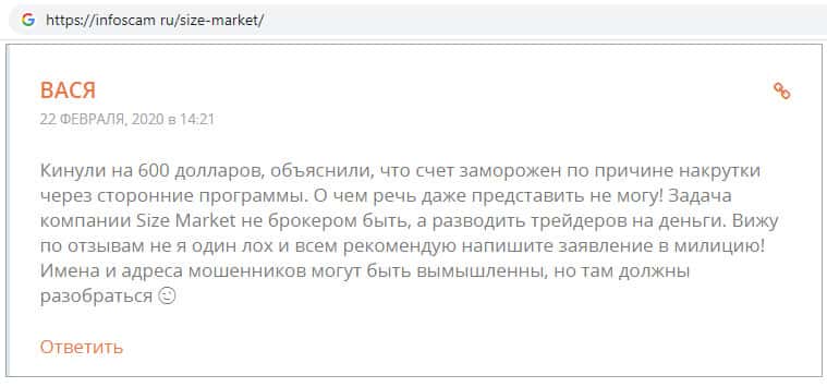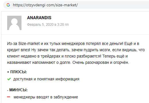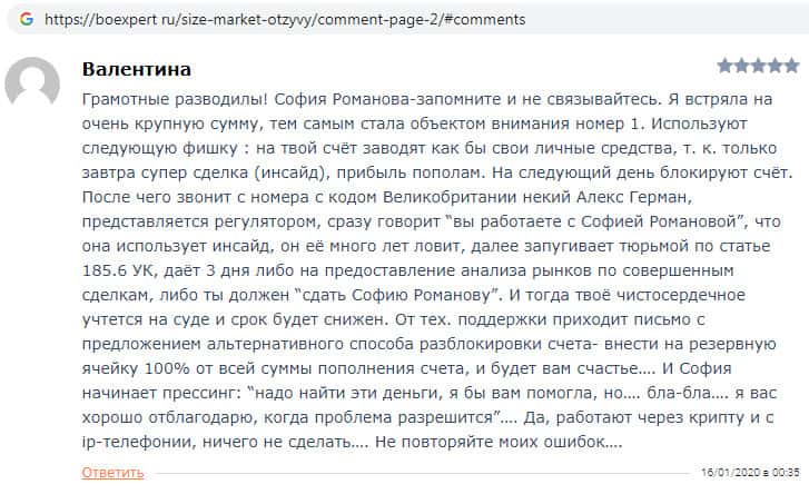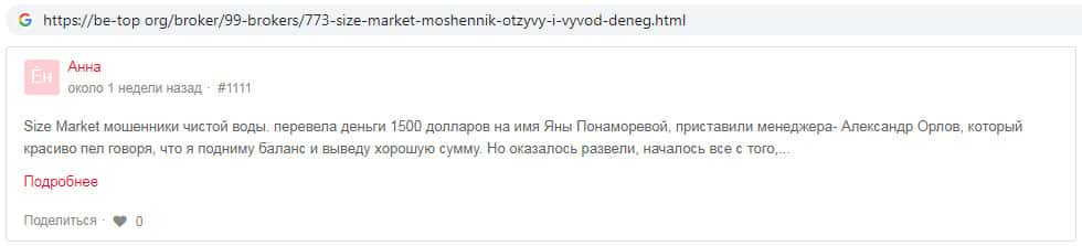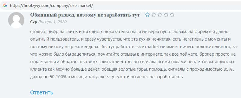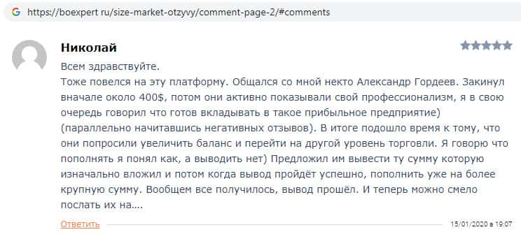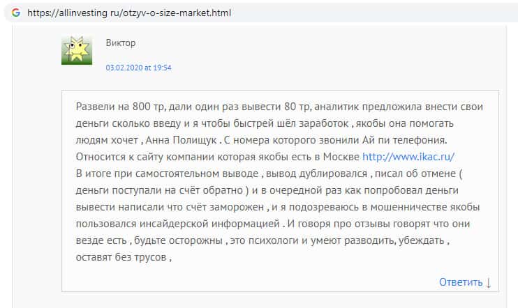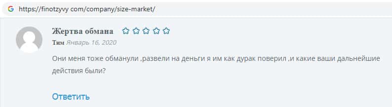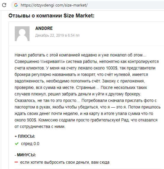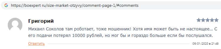 На веб-портале finotzyvy com отыскан отзыв, автором которого является очередная жертва обмана со стороны брокерской конторы SizeMarket. Автор данного комментария пишет, что его обманули и развели на деньги, забрав все себе. В результате такой торговли на подобных мошеннических сайтах, пользователи в итоге остаются ни с чем.
