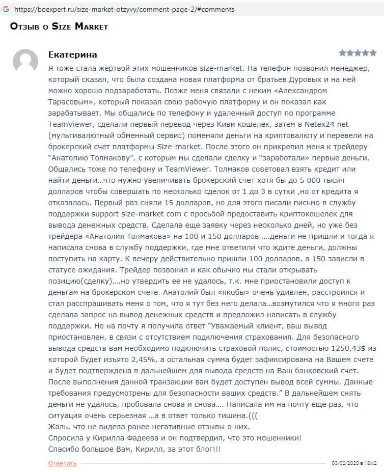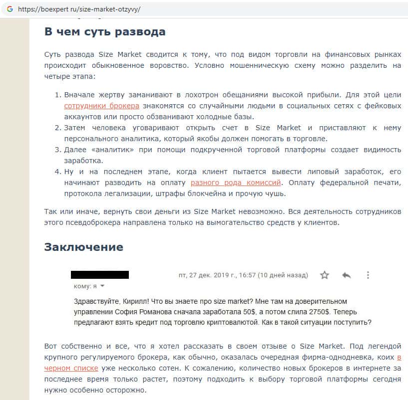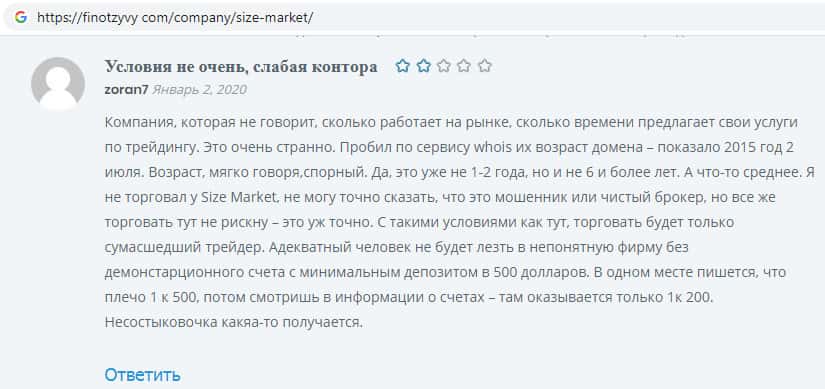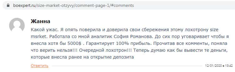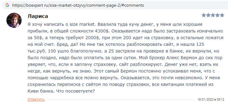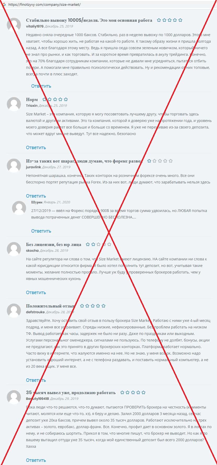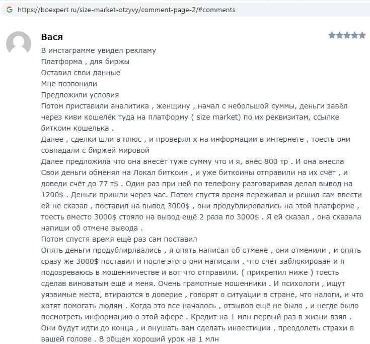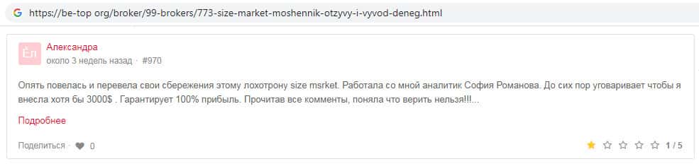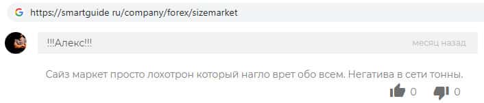 На веб-портале finotzyvy com отыскан отзыв, автором которого является очередная жертва обмана со стороны брокерской конторы SizeMarket. Автор данного комментария пишет, что его обманули и развели на деньги, забрав все себе. В результате такой торговли на подобных мошеннических сайтах, пользователи в итоге остаются ни с чем.