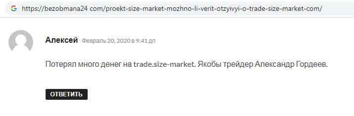 На веб-портале bezobmana24 com обнаружен отзыв, автор которого некий Алексей пишет, что он потерял много денег на мошенническом сайте Сайз Маркет, какую именно сумму потерял, не указывает. Известно лишь только то, что его денежные средства слил якобы трейдер Александр Гордеев.
