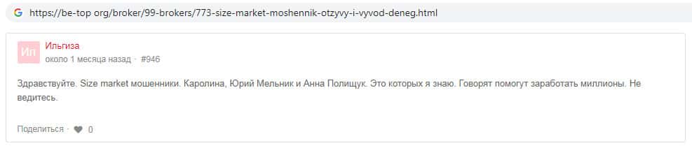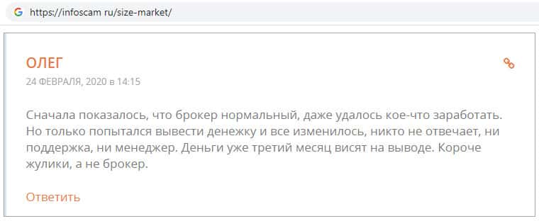 На сайте-отзовике инфоскам ру отыскан комментарий о жуликах SizeMarket, автор которого некий Олег пишет, что с начала ему показалось, что это нормальный брокер, но после того, как он перевел свои деньги, мошенники перестали выходить с ним на связь, не отвечает ни техподдержка, ни менеджер брокерской шараги.