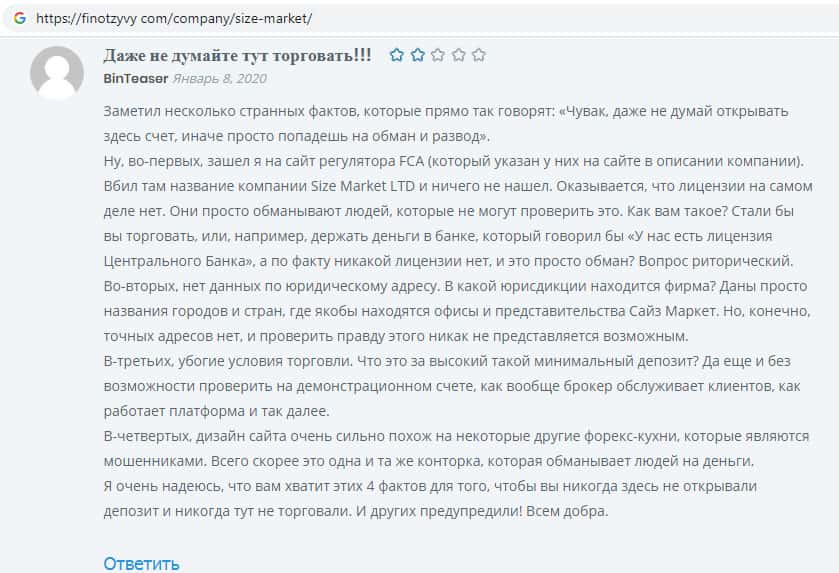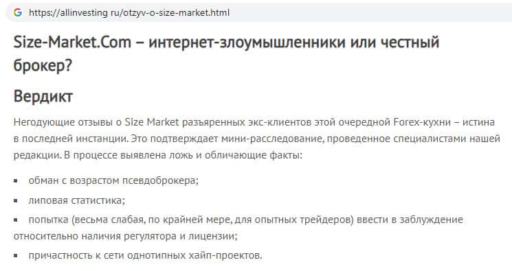 На веб-портале финотзывы ком обнаружен отзыв о брокерской конторе Сайз Маркет. Автор данного комментария пишет о том, что на сайте регулятора, который указан на сайте конторы, нет никакой информации о данной жульнической организации. Из этого можно сделать вывод о том, что компания SizeMarket липовая.