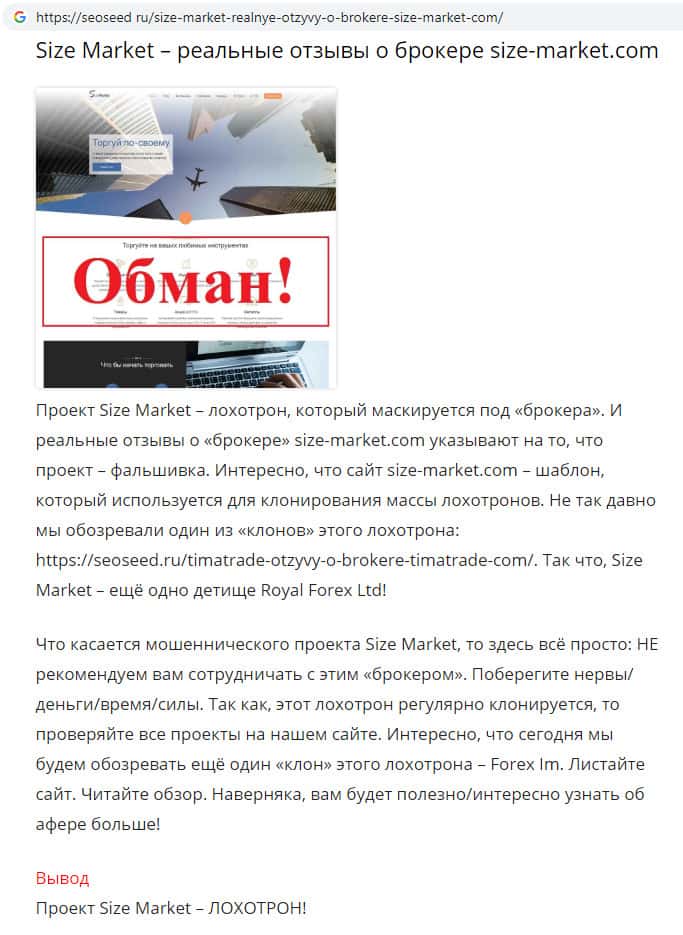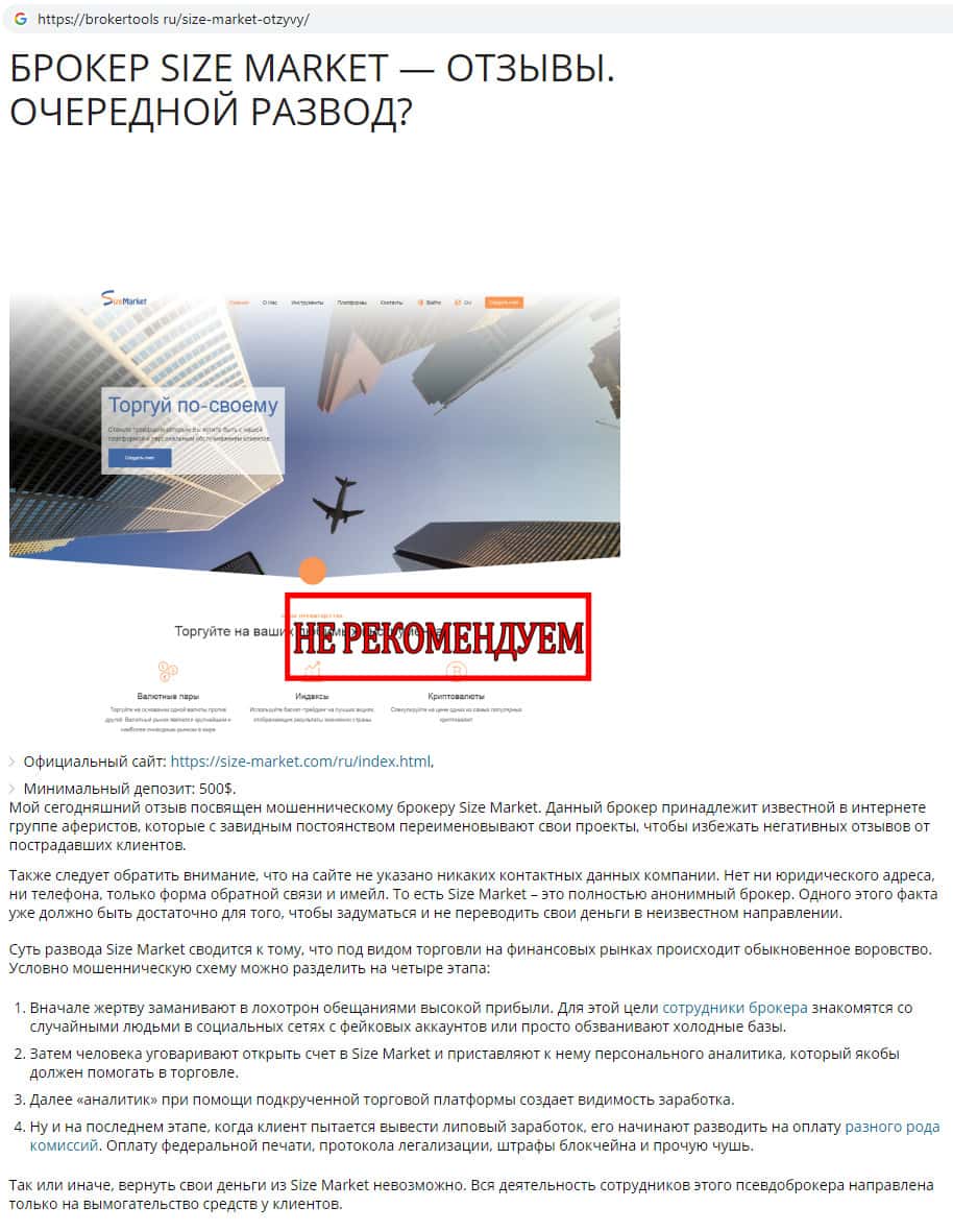 На веб-сервисе brokertools ru найдена статья о разводе со стороны скам-брокера Сайз Маркет. На скриншоте ниже предоставлена информация о том, что данной брокерской шараге нет смысла доверять. Данная группа аферистов наживается на людях, предлагая псевдо-брокерские услуги. При этом минимальный депозит зашкаливает.