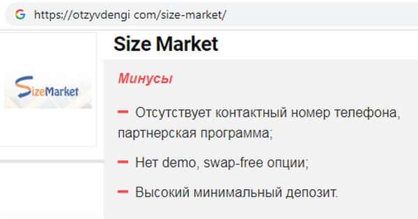 На информационном веб-портале otzyvdengi com обнаружена информация о том, что у брокерской конторы SizeMarket одни лишь только минусы, например: отсутствие контактного номера телефона, а так же высокий минимальный депозит. Связываться с подобными сомнительными мошенническими конторами не рекомендуем !!!