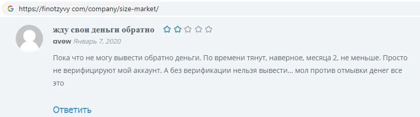 На сайте-отзовике finotzyvy com найден комментарий о том, что мошенники SizeMarket не хотят возвращать денежные средства автору данного отзыва, потому что его аккаунт якобы не прошел верификацию. При этом шулера прикрываются тем, что якобы ведут борьбу с отмыванием денежных средств.