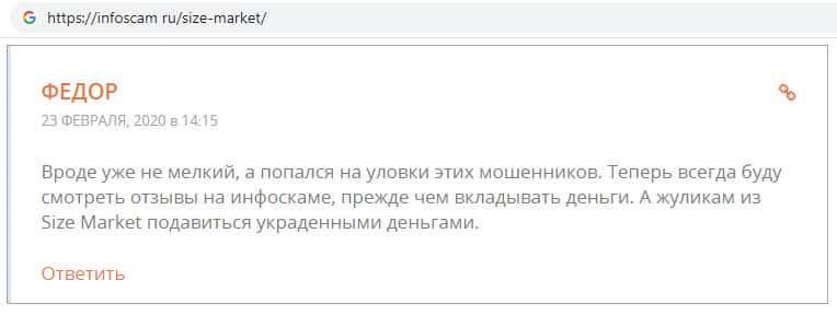 На веб-портале infoscam ru обнаружен отзыв о жульничестве Сайз Маркет. Автор данного комментария некий Федор пишет, что попался на уловки мошенников и вложил свои денежные средства. Это произошло по той причине, что пользователь невнимательно отнесся к тем отзывам, которые описывают всю деятельность скам-проекта SizeMarket.