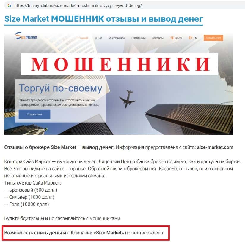 - Многие замечают правдивые отзывы о скам-брокере Сайз Маркет лишь после того, как потеряют на их сайте свои деньги
