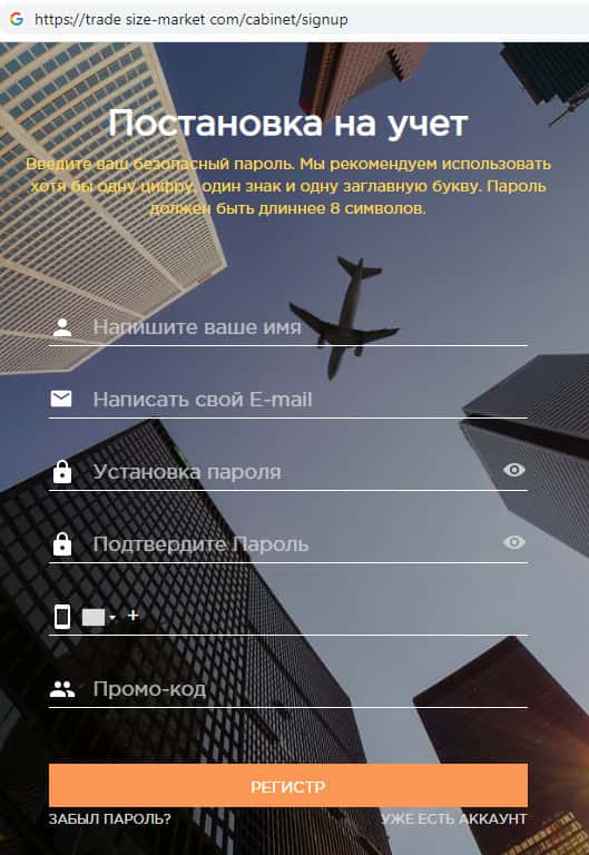 После того, как пользователь заполнил бланк, компания Сайз Маркет просто так не отвяжется. Не рекомендуем оставлять какие-либо данные о себе на сайте фальшивого брокера SizeMarket даже в виде адреса электронной почты, поскольку шулера могут манипулировать человеком и воздействовать на принятие решения пользователя торговать на данном сайте.