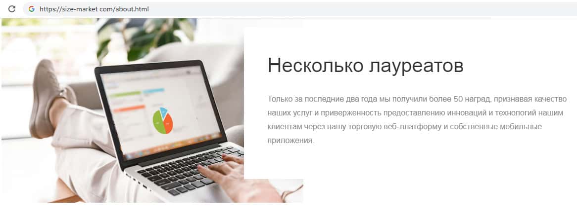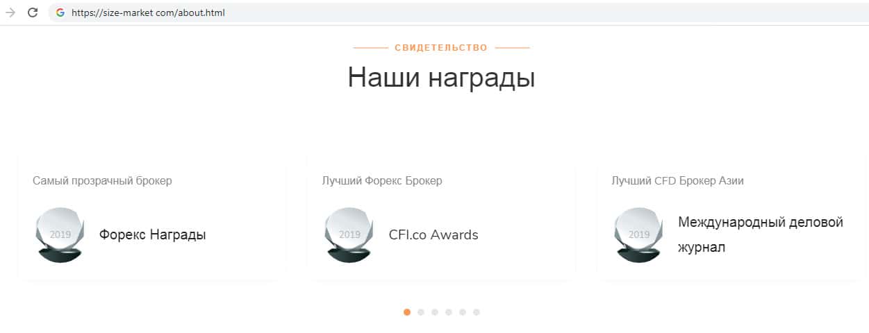 На официальном сайте скам-брокера Сайз Маркет отыскана информация, которая вероятнее всего не имеет никакого отношения к данной организации, а именно какие-то награды, а точнее изображение наград. Не верьте мошенникам SizeMarket и их якобы достижениям, они ничего не значат !!!