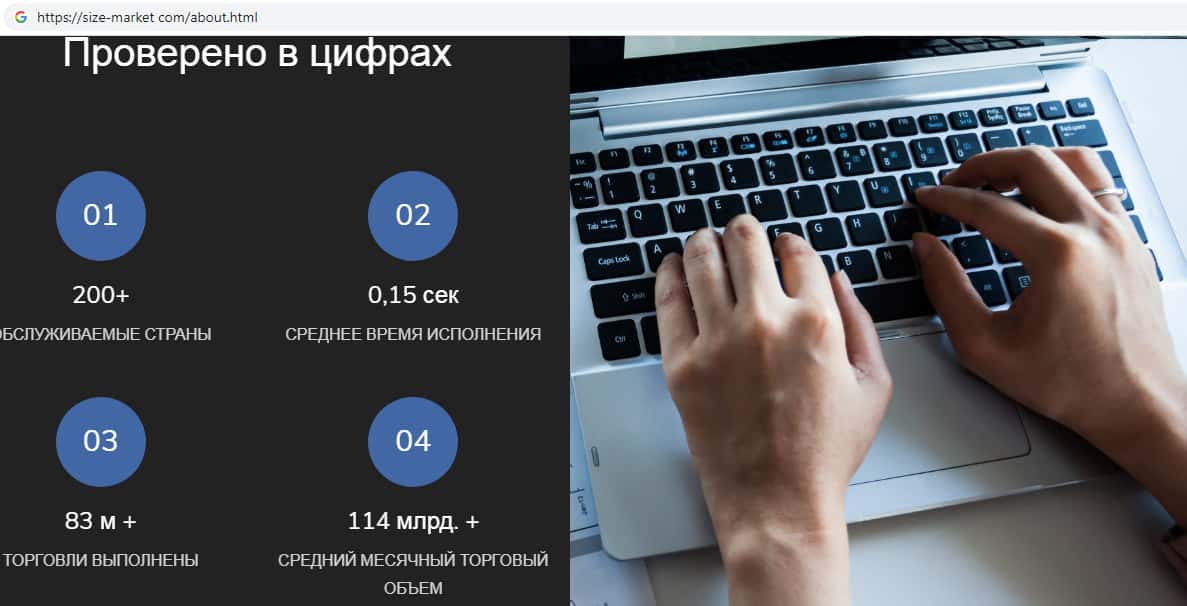 Официальный интернет-ресурс аферистов Сайз Маркет по своему содержанию практически не отличается от сайтов подобных мошеннических организаций, обещания все те же и результат торговли естественно такой же убыточный. Сам сайт брокерской конторы SizeMarket очень сильно виснет и долго грузится.