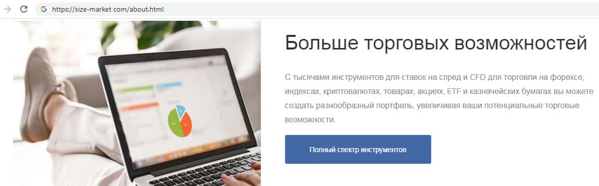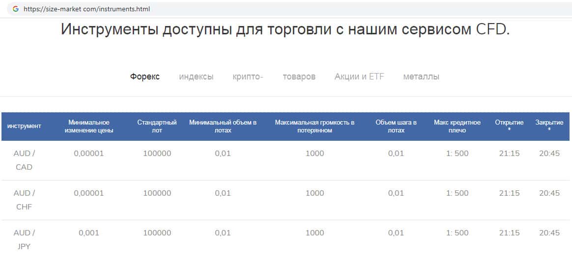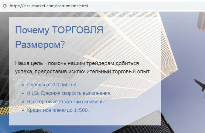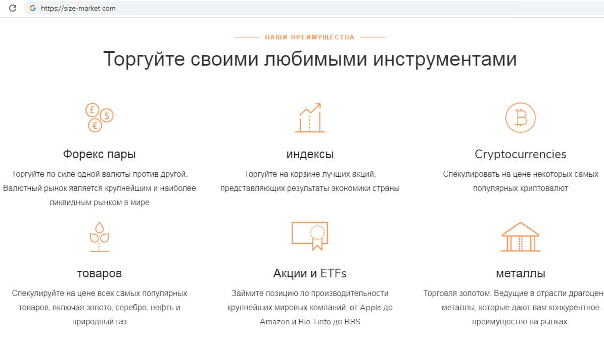 Здесь аферисты Сайз Маркет дают возможность пользователям сайта ознакомиться с перечнем торговых инструментов, с которыми якобы специалисты будут совершать сделки и зарабатывать Вам деньги. Верить в такого рода сказки скам-компании SizeMarket нельзя, поскольку похожая информация очень часто встречается на сайтах подобных брокерских контор.